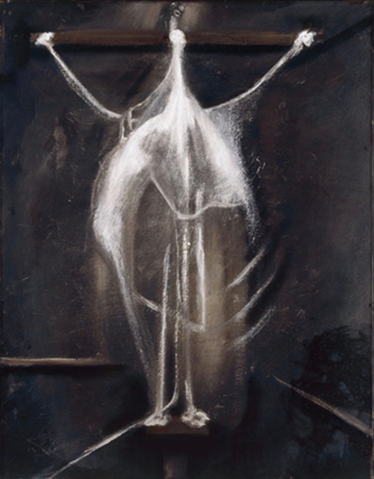 Bacon later dismissed much of this early work, additionally David Sylvester observed that there was “not much consistency in what he did, in style or in quality, until the 1940s.” That judgment is broadly fair. Yet it risks flattening what is already distinctive. Crucifixion (1933), with its attenuated white figure suspended against a dark ground, is not merely an early experiment but an image that has continued to exert force. Damien Hirst, who owns the painting, has described Bacon at this stage as “grasping for something in the shadows.” The phrase is apt. Even here, something is already hatching: an unstable body, an enclosing space, and a pressure between the two that would become central to Bacon’s work. Seen from the later paintings, these early images do not dissolve into their influences; they mark the moment when a singular language first becomes visible.