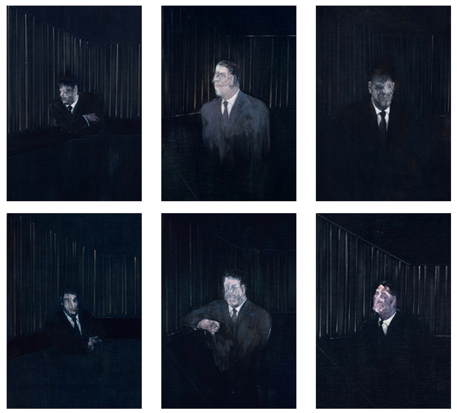 Structure takes precedence here, and expression is pushed to the margins. The repeated figure allows Bacon to test how much variation the image can bear without breaking its underlying framework. Small shifts in posture, facial distortion, or tonal weight register as disturbances within an otherwise stable system. The room functions as a diagram rather than a setting, and repetition becomes a way of thinking rather than narrating. In these works, Bacon’s language of enclosure, isolation, and pressure is no longer tentative. It has found a form capable of sustaining repetition.