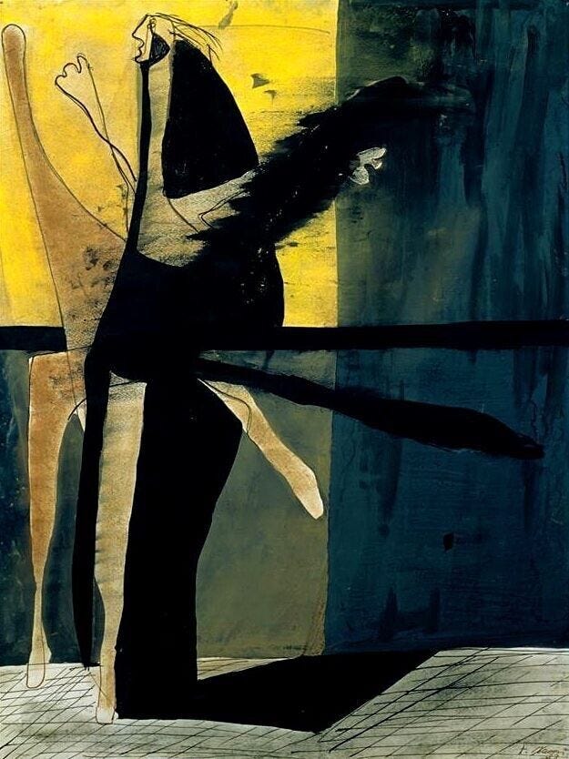 This is where Bacon becomes unmistakable. The language finds its footing. Figures appear already contained, pressed into shallow rooms and edged by transparent cages or architectural lines. Space asserts itself as force rather than background, tightening around the body and holding it in place. These structures function as diagrams: a means of thinking through what it means for a figure to exist under pressure.