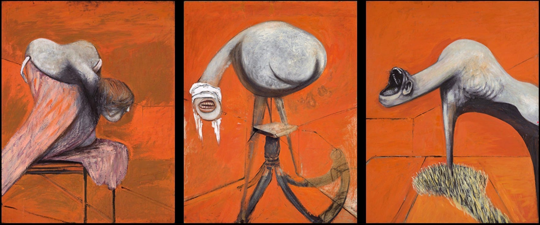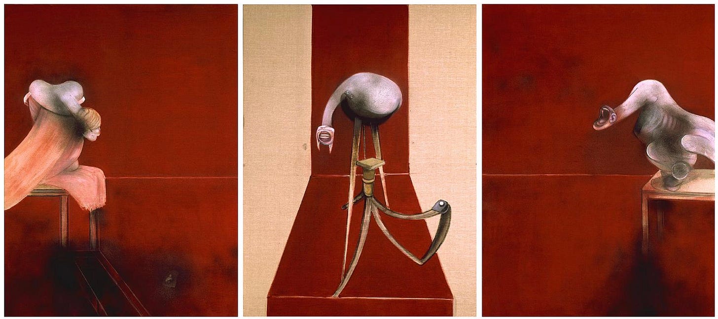 From the late 1940s onward, Bacon increasingly began to work in triptych form, returning to it again and again over the following decades. These three-panel works became one of the most recognisable structures of his practice, used across different subjects and periods rather than reserved for a single motif. Rather than treating the triptych as an occasional format, Bacon made it a sustained way of working, producing numerous variations within the same compositional frame. This body of work now stands at the centre of how his painting is understood. In the next post, I’ll turn to the triptychs themselves, looking more closely at what drew Bacon to this structure and how it shaped the direction of his work.